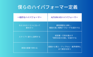 ▍僕らのハイパフォーマー定義  ̄ ̄ ̄ ̄ ̄ ̄ ̄ ̄ ̄ ̄ ALTURA Xでは、「目の前の数字を追う」だけではなく、 業界のゲームチェンジを創るプレーヤーを求めています。 ▍私たちが大切にしている問い・論点  ̄ ̄ ̄ ̄ ̄ ̄ ̄ ̄ ̄ ̄ ・なぜアポが取れなかったのか?何を変えれば次は反応が得られるか? ・お客様が“今”困っていることは何か?表層の言葉の裏にある課題は? ・フィールドセールスにどう繋げれば、スムーズに商談に入れるか?