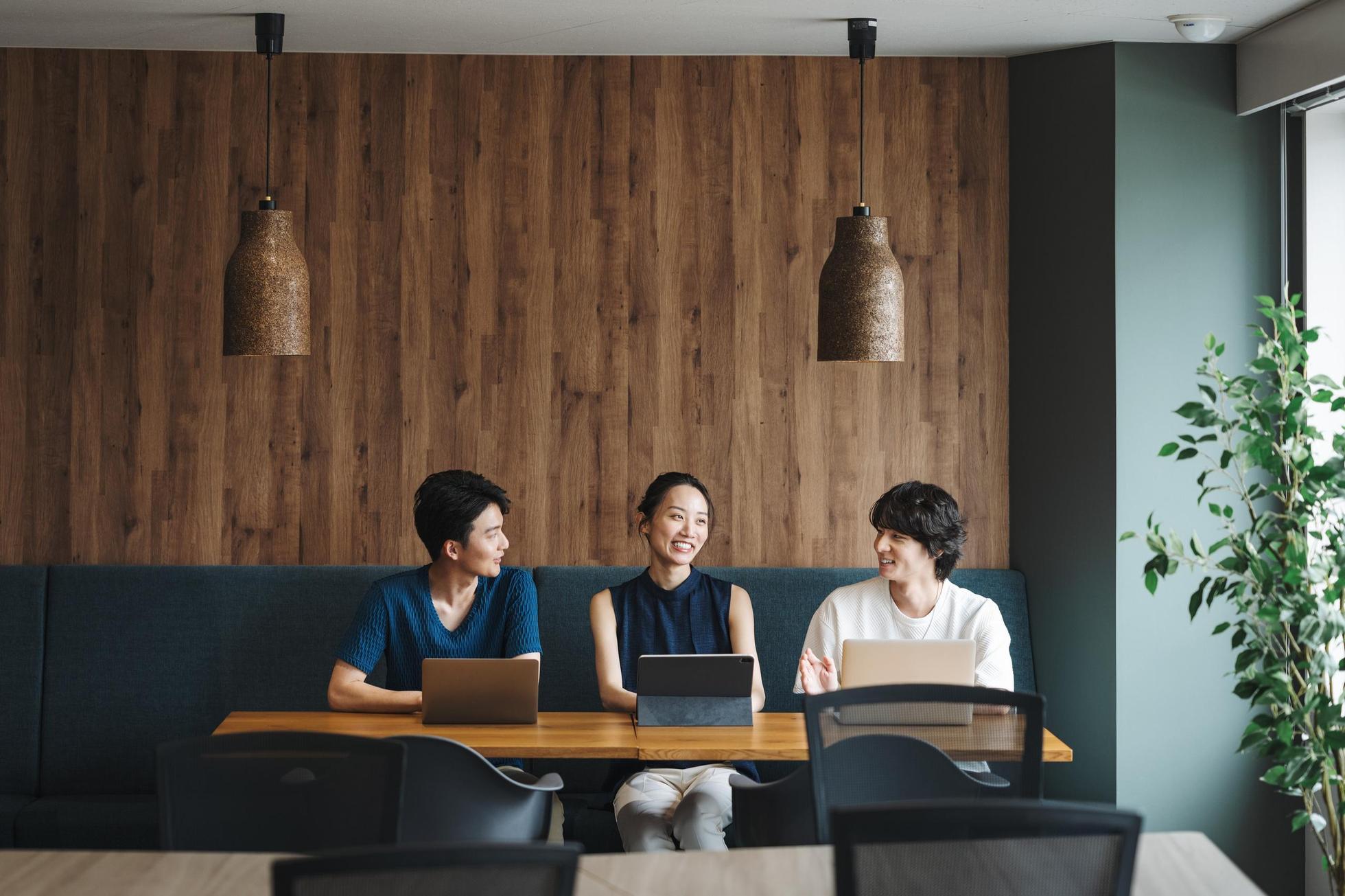 打ち合わせ中。HOMEがテーマの本社はリラックス感があるので、和やかな雰囲気で話し合いが進みます。