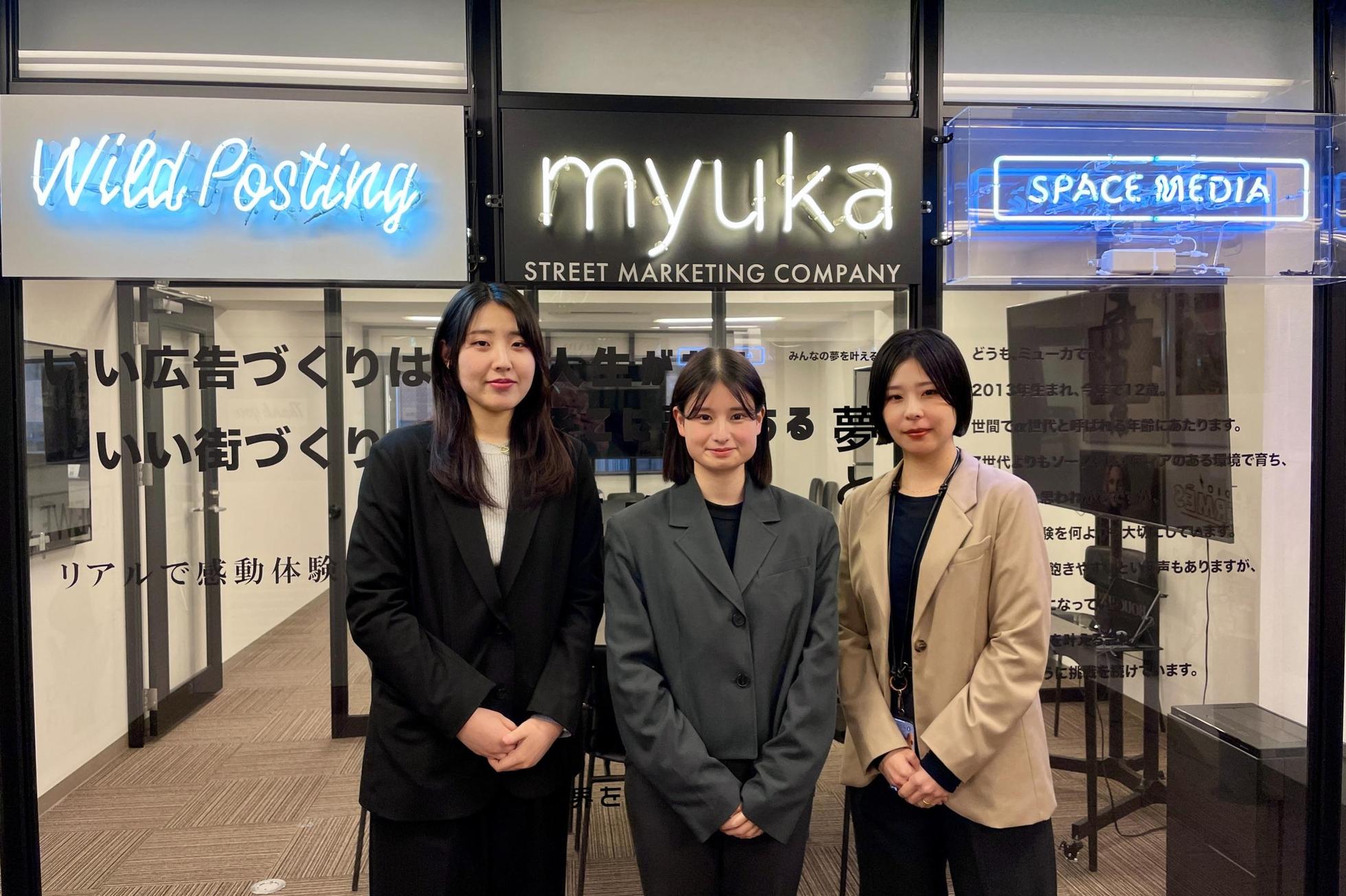 22卒の新卒1年目。 海外の文化に興味があり、大学では日本の文化と海外の文化を比較し、異文化理解について学びました。 また、第二外国語で韓国語を選択しました。 小学生の時から韓国が好きで、韓国でもよく行われている応援広告をきっかけにミューカを知り、 ミューカが行っているWILD POSTINGをはじめとした屋外広告やイベントなどの事業内容や一緒に働く社員を見て一緒に働きたいと思い、入社をしました。 自分が関わった広告が街中に出て、話題になったり、写真を撮ってくださる方も多く、とてもやりがいがある仕事です。