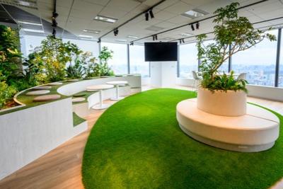カラフルなカフェスペース、緑あふれる自然エリア、ダーツバーのような遊び心のあるオフィス