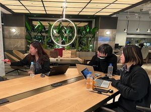 オープンスペースで現状を整理するために打ち合わせをするSEOチームの一コマ