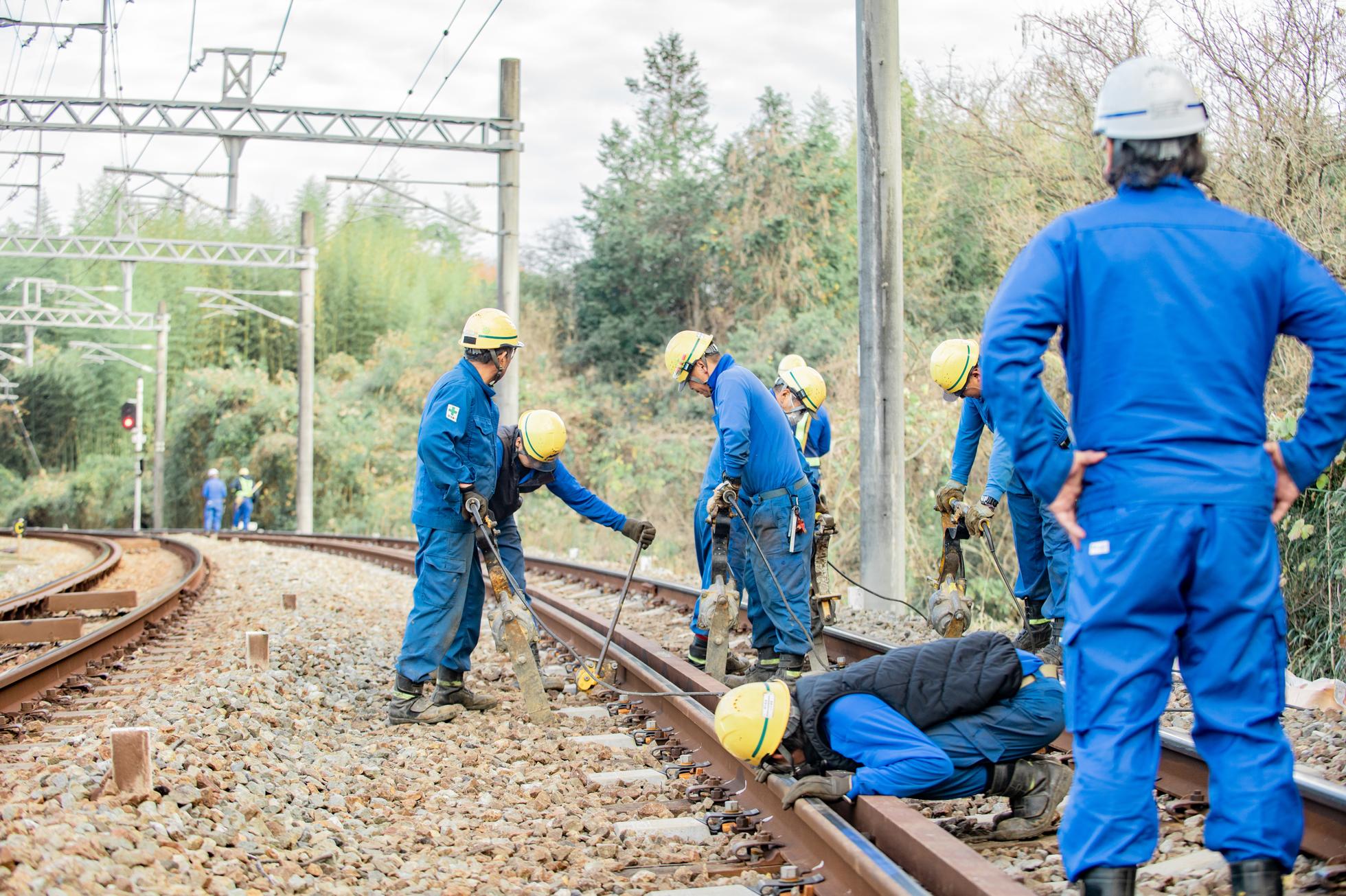 線路工事をする現場。多くの仲間と一緒に鉄道の安全、社会インフラを守ります!