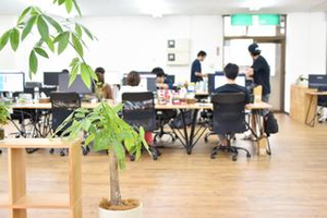 【沖縄オフィス】久茂地の駅前の立地のいい場所にオフィスがあります。リノベーションした社内はウッドベースで温かみがあります。壁は少なく開放的、シンプルだけど無機質にならないように植物を置いています。また、エリア分けして照明を変えることでリラックス・落ち着いて仕事ができるような空間になっています。