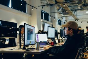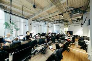 元撮影スタジオを改装したオフィス。撮影機材などはそのままに。天井が高く明るいオフィス。