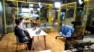 オンライン研修もプロ仕様のスタジオからお届け。これはリハーサルの様子ですが、実際には受講生のみなさんの顔を大モニターに表示しながら表情を見て研修を進めていきます。