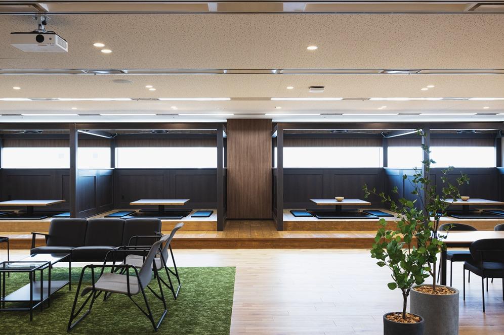 1フロアのオフィスには芝生やこたつのスペースもあり、メンバー間のコミュニケーションの機会を大事にしています。