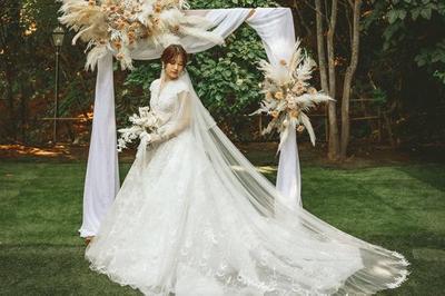 海外のアトリエでハンドメイドされた、軽やかで美しいシルクに1つ1つ手縫いで作られた刺繡でできたウェディングドレス。ウエストからふんわりと広がった愛らしいシルエットはお姫様そのもの。