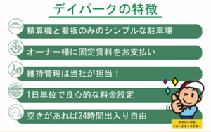デイパークは「良心市」の原点を大切にし、素朴で質素でそして良いもの(安価)をシンプルに提供している会社です。 「1日貸しの駐車場」という、新しいビジネスモデルを展開しています。これは新規開拓のチャンスも多く、成果も出しやすいのでビジネスモデルとして成長してきたいと思っています。