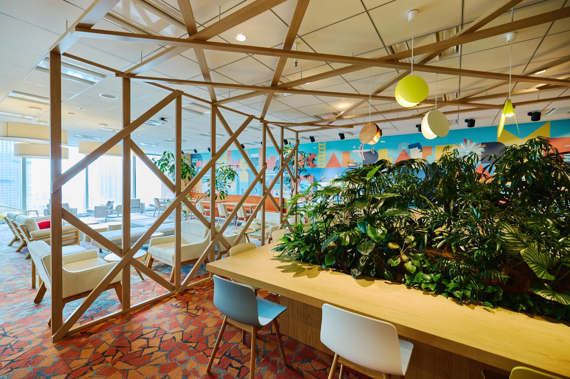 社員の憩いの場、リフレッシュルーム。写真では伝わりにくいですが100名規模のイベントができるゆったりとしたスペースで社員が休憩したり談笑しています。