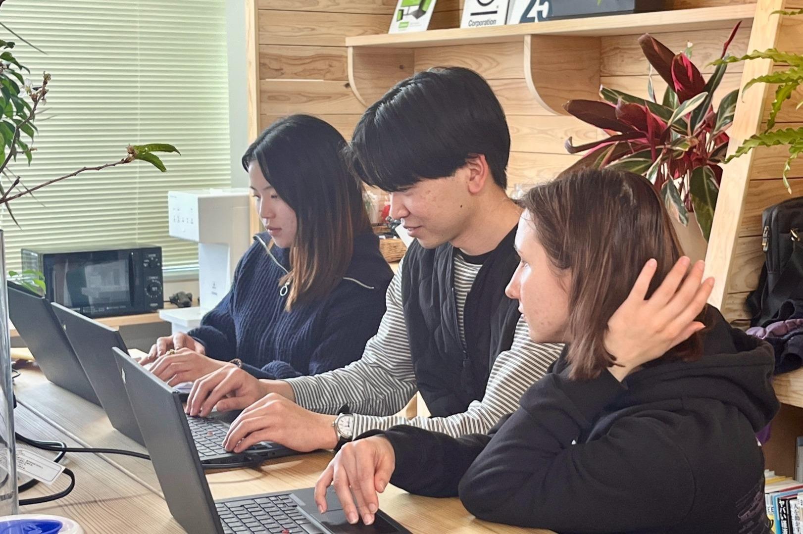 福岡本社。温かみのある木のデスクと、たくさんのグリーンに囲まれて。