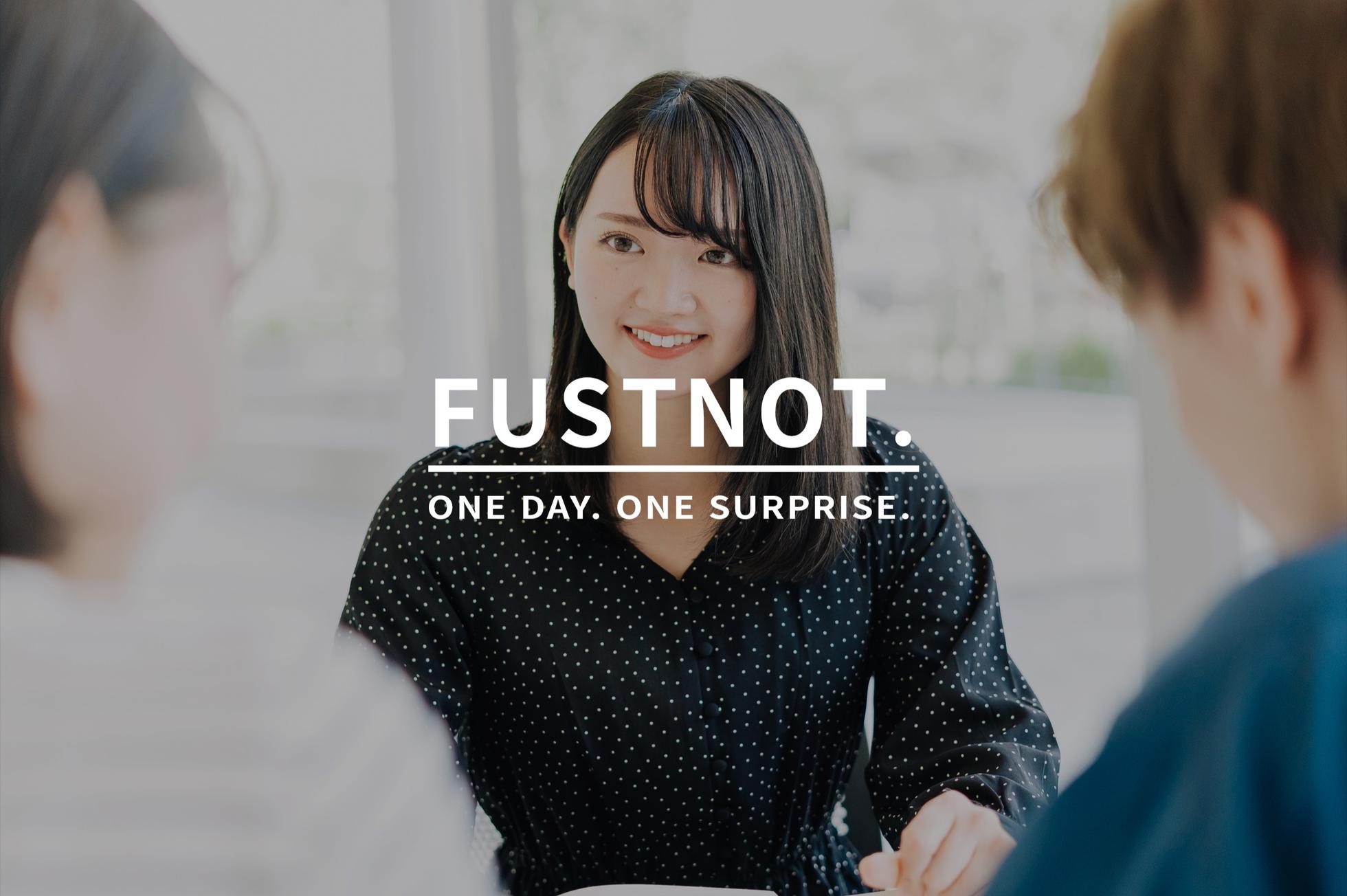 【 The future starts today, not tomorrow. 】 未来は今日始まる。 明日始まるのではない。 ヨハネ・パウロ2世が残した言葉です。 FUSTNOT.という社名の由来にもなります。 自分が社会人としても人としても成長するには、 「明日やろう」という考えを捨て、 今の自分が出来る最大のパフォーマンスを日々発揮する事が 成長への近道だと思っています。