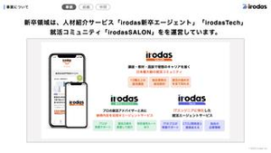 ---------------------------------------- irodasとは? ---------------------------------------- 私たちは、" Create 100,000,000 Colors - 1億色を創る - "をビジョンに人の可能性に向き合うキャリア支援企業です。新卒領域の人材紹介事業をメインに、約15,000人が登録するコミュニティ型キャリア教育サービス「irodasSALON(イロダスサロン)」と「irodas 新卒エージェント」、「irodas Tech」を運営しています。 ---------------------------------------- 新卒人材紹介事業 ---------------------------------------- <irodas SALON(イロダスサロン)とは?> irodasSALONは、働く"意義"を改革するキャリア教育サービスです! 年間2万人以上の就活生に対して「就活」の前にキャリアや自分に対して向き合うためのキャリア教育コンテンツを用意して意思を持ったファーストキャリア選択のサポートをしています。 ▼サービスコンテンツ 1)キャリア講座   合計10種類以上のキャリア講座を提供。   「自己理解」「企業理解」「社会理解」を高めてキャリアに向き合っていきます。 2)キャリア形成教材  『本気で納得できるファーストキャリア選択』を実現するためにワーク型のキャリアブックを独自開発し、ユーザーの自宅へ無料で配布しています。合計160ページを超えるワークシートで、自分の強みや就活の軸を明確にすることができます。 <新卒エージェントとは?> irodasのキャリアアドバイザーが就活生の自己分析や選考対策をサポート!就活生には自身の人生に向き合い、実現したい将来像を描いてもらうサポートも行い、一人ひとりに合ったファーストキャリアの選択の支援を行っています。 <irodas Techとは?> ITエンジニアを目指される就活生に特化した就活支援をしております!もちろん自己分析や選考対策のサポートから、ITエンジニアとしてどんなキャリアを描きたいか、そのキャリアを実現するためのファーストキャリアの選択の支援を行っていただきます。