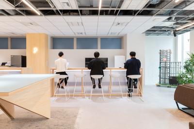 リモートokですが、オフィス環境も整っています。日中はフリースペースで仕事をすることも。