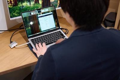リモート対応や打合せがふえて、大きなモニターをフル活用。専用カメラ・スピーカーなど環境は万全です。