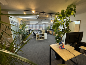 メインのオフィスフロアには観葉植物たちが元気に育っています。観葉植物が元気なのはオフィスに活気がある証拠!疲れにくいオフィスチェアや広々デスク。疲労軽減効果もある照明、空が見えるオフィス。癒しの観葉植物。