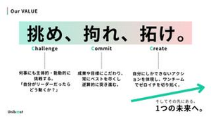 Uniboostは3C VALUEである「挑め、拘れ、拓け」を体現し、AIと人の力で“ビジョンドリブンな社会”を仲間とともに本気で創るチームです。 1.挑め(Challenge) 何事にも主体的・能動的に挑戦する。 「自分がリーダーならどう動くか?」を常に考え、事業や課題に向き合う。 新しいサービスや仕組みをゼロから形にするチャンスが日常的にある。 2.拘れ(Commit) 成果や目標にこだわり、常にベストを尽くす姿勢を大切にする。 数字や結果だけでなく「MVVに沿った取り組みか」を徹底して意識。 チームで切磋琢磨しながら、一人ひとりが責任と誇りを持って仕事を進める。 3.拓け(Create) 自分にしかできないアクションを体現し、ワンチームでゼロイチを切り拓く。 制度や仕組みに縛られず、新しい働き方やキャリアの可能性を開拓する。 イベント・プロダクト・空間運営など、既存の枠を超えた挑戦に関われる。