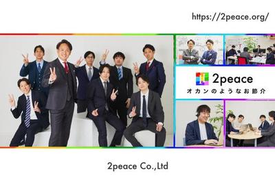 株式会社2peaceは「オカンのようなお節介で温かく」をスローガンに、企業の採用活動と求職者の転職活動支援をメインに事業を展開している、大阪のベンチャー企業です。 人財紹介/人財派遣/人財教育/HRコンサルティングまで、人に関わるあらゆる悩みを解決します。 「無資格・未経験」でも社会参画できる仕組みを作り出し、採用市場の変化と、採用現場の動向をしっかりと捉え、企業も働く人も前向きに社会貢献ができる世の中を、人財事業を通じて創出していきます。 【事業内容】 「人財紹介」 全国求人案件数20000件。求職者エントリー数1000人超/月を取り扱っています。「求職者ファースト」の寄り添い方で、全国の転職市場を支えます。求職者だけではわからないこと、判断しづらいことも、転職までの伴走支援でサポートします。20代〜40代の転職を積極的に応援しています。また製造業の転職支援も積極的に取り組んでおり、大手製造会社から地方の町工場まで幅広く取り扱っています。 「人財派遣」 関西を中心に幅広く対応しています。特に製造/販売/営業/事務といった安定した継続的な仕事に強く、就職後も徹底した伴走サポートを行います。 「HRコンサルティング」 条件だけでは差別化できない企業を中心に、採用の「見える化」を基準に採用につながるコンサルティングを行っています。MVVの再設定から、労務環境の改善、人事評価制度の設定まで、人財紹介会社の領域を超えて伴走支援を行なっています。 「インターン生の採用」 新卒採用支援を行いながら、自社のインターン生採用も取り入れています。企業には社員が、学生にはインターン生がアプローチを行う形式を採用しています。学生の理想の就活を形にするために、学生ならではの発想とポテンシャルで活躍の場を提供しています。 「キャリア教育事業」 中高生を中心に、働く意味と働くことに対する考えを、遊びの中から学ぶ「アソビカケル」事業を展開しています。職能ではなく「人間力」を養うきっかけをキャリア教育の中から創っていきます。 「SES事業/エンジニア雇用」 エンジニア人財の雇用を支えるために、2024年からSES事業の展開をしています。正社員、契約社員、業務委託と働き方も様々になります。全国の案件を扱い、エンジニア能力に合わせて幅広い提案ができるように取り扱っています。 【今後の展望】 2025年には、社員数を20名に増やす計画です。各業種の担当を専任で任せ、より広い業種に、より深く関われるように事業規模拡大を計画しています。またM&Aによる事業規模拡大も計画しており、人財会社だけでは満たせなかった領域まで一貫したサポートができるように展開していく計画です。 売り上げ規模と共に、当社のサービスを通して世の中にどんな変革を与えられるかを大切にしています。また、社会問題にアプローチできる事業を設計して、社会貢献を軸に世の中を変えられるサービスを創り「あなたにとって唯一無二の存在」となることを目指します。 【熱くなれる仲間募集】 若手人財を中心に、人の想いに共感し、ともに成長できる仲間がたくさん集まっています。 ・人の事を大切にできる方。 ・一丸となって、事業を作り上げたい方。 ・挑戦することを恐れず、成長意欲の高い方。