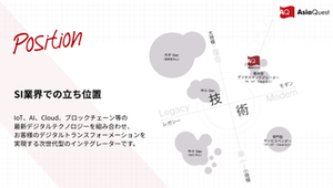 アジアクエストは企業のDXを支援する「デジタルインテグレーター」です。 通常のシステムインテグレーションだけではなく、お客様のDXを共に考えるコンサルティングから、DXに必要なデジタルテクノロジーを駆使したシステムの設計、開発、運用までを一貫して請け負います。 2012年に設立し、東京、福岡、大分、大阪、インドネシア、マレーシアにオフィスを構えており、2021年に東証マザーズ(現グロース市場)に上場いたしました。 IoT、AI、Cloud、Mobile、Web、UI/UXの各デジタル分野の専門テクノロジーチームを有し、お客様のゴールに向けて最適なプロジェクトチームを編成します。DXに関する豊富な知見と幅広い技術力により、ビジネスモデルの有効性や技術的な課題を検証する為のPoCの実施やデジタルに対応した大規模なシステムの構築まで、スピーディーな対応が可能です。 ■コンサルティング 最上流から開発・運用・効果測定まですべてをサポートします。ハイレベルのマネジメントコンサルタントとテクニカルコンサルタントのシナジーにより、市場調査から戦略立案、計画建てから実行・運用までをワンストップで提供します。 ■IoT/AI センサーやAI/ビッグデータを活用したシステム開発・提供を行っています。例として、建設現場の管理業務の遠隔化に向けて、建設現場に設置され様々なIoTセンサーで取得したヒト・モノのデータを、デジタル空間の仮想建設現場上に表示することで、リアルタイムに建設現場の状態を可視化することができるデジタルツインシステム「3D K-Field」を開発。また、自社サービスであるIoTプラットフォーム「beaconnect plus」の提供も行っています。 ■Cloud AWSやAzure、Google Cloudなど主要なクラウドサービスの設計、環境構築、オンプレミス環境からの移行のサポートが中心です。クラウド、サーバー、ネットワーク、ストレージ、仮想化環境など、顧客のITインフラ環境を構築~移行~運用管理までサポートする「マルチクラウドマネージメントサービス(まるクラ)」の提供も行っており、自社サービス運営を通じたクラウドや仮想化案件に強みがあります。また、SESでの設計構築案件では、大手SIerとの直取引案件が多くを占めています。 ■Webシステム/モバイル開発 フルスクラッチでの「ECサイト構築ソリューション」「CMSサイト/BLOG構築」「会員サイト/コミュニティサイト構築」「Webキャンペーンシステム構築」などの受託開発実績があります。さらにスマートフォン/タブレットアプリ開発においては、「ソーシャルメディア連携アプリ」「ECショッピングアプリ」「カタログ・ディスプレイ用業務アプリ」「営業支援・SFAアプリ」などを手掛けています。受託案件を中心に幅広い領域・規模の案件があり、提案からデザイン/開発、運用までワンストップで対応しています。 ■UI/UX 企画立案、UI/UXデザインから実装まで一貫して対応し、顧客体験価値を向上させます。最新の言語/フレームワークや、ノーコード/ローコードツールなどを使用しモダンな環境で開発します。⼈事労務SaaS開発⽀援案件や、レストラン検索サイト改善案件などさまざまな案件事例があります。
