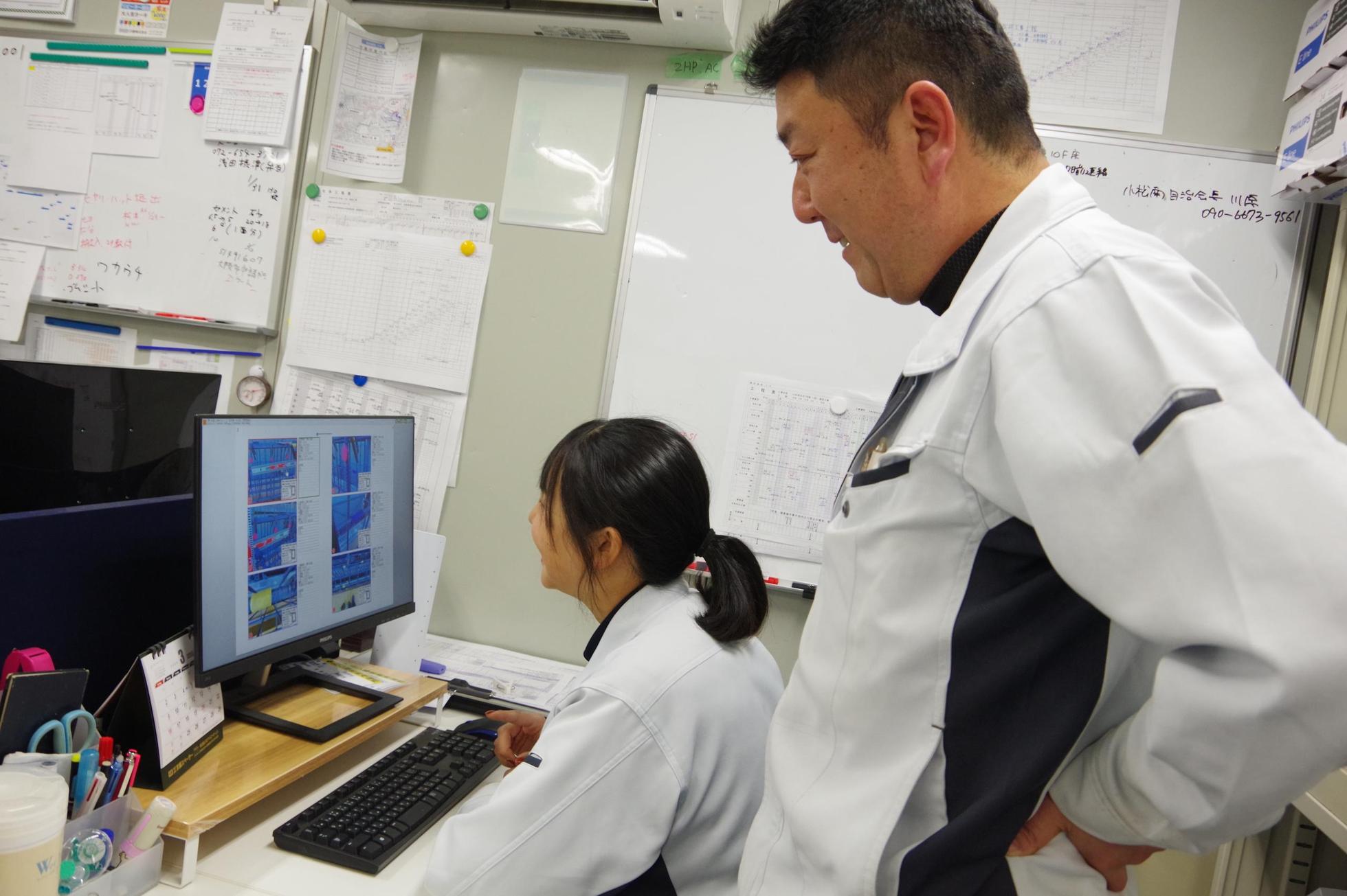 現場だけでなく、オフィスでも建設の仕事は続いています。施工計画の確認や工程管理、品質に関する検討など、一つの建造物を完成させるために丁寧な打ち合わせを重ねます。分からないことはその場で確認し、経験を共有しながら進めていくことで、技術と知識を次の世代へつないでいます。