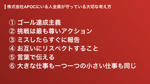 ▍20代〜30代の若手が中心。フラットで心理的安全性の高い組織 APOCは、創業メンバーの齋藤、後藤をはじめ、20代が中心となって動かしている組織です。また、社員数4名と業務委託・インターン数名の少数精鋭だからこそ、一人ひとりの裁量が大きく、意思決定のスピードも圧倒的です。上下関係を気にせず意見を出し合えるフラットな文化があり、メンバー同士がお互いをリスペクトし合うことを大切にしています。 ▍創業メンバー直下での徹底したOJTと「スタンス」重視の育成 事業開発のポジションでは、代表や創業メンバーのすぐ隣で仕事を学びます。特別な研修プログラムがあるわけではありませんが、実際の商談やプロジェクトの最前線に立ち、実務を通じてスキルを習得する「超実践型」の教育体制です。私たちが重視するのは、スキル以上に「素直さ」「前向きさ」「自ら改善案を出す姿勢」というスタンスです。 ▍2ヶ月に1回の「チーム合宿」で絆を深める 日々の業務だけでは見えない一面を知り、より深く語り合うために、数ヶ月に一度、チーム合宿やご飯会を行っています。サウナ付きの別荘を借りてリフレッシュしたり、時には朝方までボードゲームで盛り上がったり。まるで部活動のような一体感があり、この「遊び心」が日々の業務での高いパフォーマンスに繋がっています。 ▍カルチャーを大切にすること APOCでは、スキルや経験以上に、どんなスタンスで仕事に向き合うかを大切にしています。 私たちが共通して大事にしているのは、次の6つのカルチャーです。 ① ゴール達成主義 プロセスよりも、「ゴールを達成できたか」を最も重視します。 今の行動がゴールにつながっているかを常に問い続けます。 ② 挑戦は最も尊いアクション 挑戦すること自体に価値があります。 失敗を恐れて動かないより、仮説を持って行動し、学ぶことを評価します。 ③ ミスしたらすぐに報告 ミスを隠さず、すぐに共有する。 個人を責めるためではなく、チームとして最速で改善するためのルールです。 ④ お互いにリスペクトすること 役職や年齢、得意分野に関係なく、互いの価値を尊重します。 一人ではなく、チームで成果を出すことを大切にしています。 ⑤ 言葉で伝える 思っているだけでは伝わりません。 良いことも、違和感も、きちんと言葉にして伝えることを重視します。 ⑥ 大きな仕事も、一つ一つの小さい仕事も同じ 目立つ仕事も、地道な作業も、すべてがゴールにつながっています。 どんな仕事にも責任を持って向き合います。