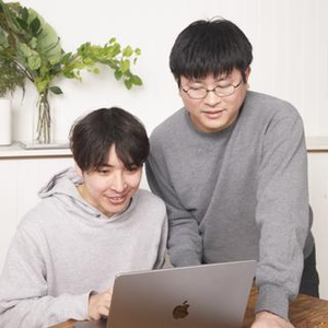 開発状況を共有中のエンジニア:松田と薬剤師目線でコメントする小野。自称「ITオタク薬剤師」を名乗る小野は、薬剤師知見と元々のIT好きを活かし、プロダクト企画にも積極的に関わっている。