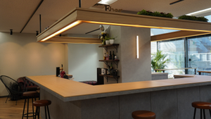 オフィスに併設されているカフェスペースのソファで打ち合わせ