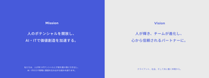 RCIのMission、Vision、Valueをご紹介します。 詳細は、下記ページをご参照ください。 https://rci-a.com/company/#philosophy ■Mission(存在意義) 人のポテンシャルを開放し、AI・ITで価値創造を加速する。 ■Vision(目指す理想の姿) 人が輝き、チームが進化し、心から信頼されるパートナーに。 ■Value(ステークホルダーに対する提供価値) ①目的志向 ②正しい選択・行動 ③多様性と個性の尊重 ④スピードの追求 ⑤ファイティングポーズ