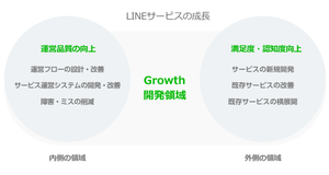 ■LINEにおけるGrowth開発の必要性 LINEは新しい分野にサービスを拡大し、スマートポータルとして進化を続けています。 しかし、No.1のサービスであるためには、サービスを生み出す力と同じく、生み出したサービスを成長させていく力が不可欠となり、Growth領域専門の開発組織をつくりました。 私たちはLINEが提供するあらゆるサービスに関わり、Growth開発業務を牽引することで継続的な成長を支えます。 ■LINEサービスの成長とGrowth開発について Growth開発には、サービスの機能追加や改善によるエンドユーザーの満足度、ユーザビリティの向上だけでなく、管理ツールの使い勝手の向上・運営者の負担を減らすフローやシステムの設計といった外からは見えにくい部分も含みます。私たちは両面からサービスの成長を支えています。