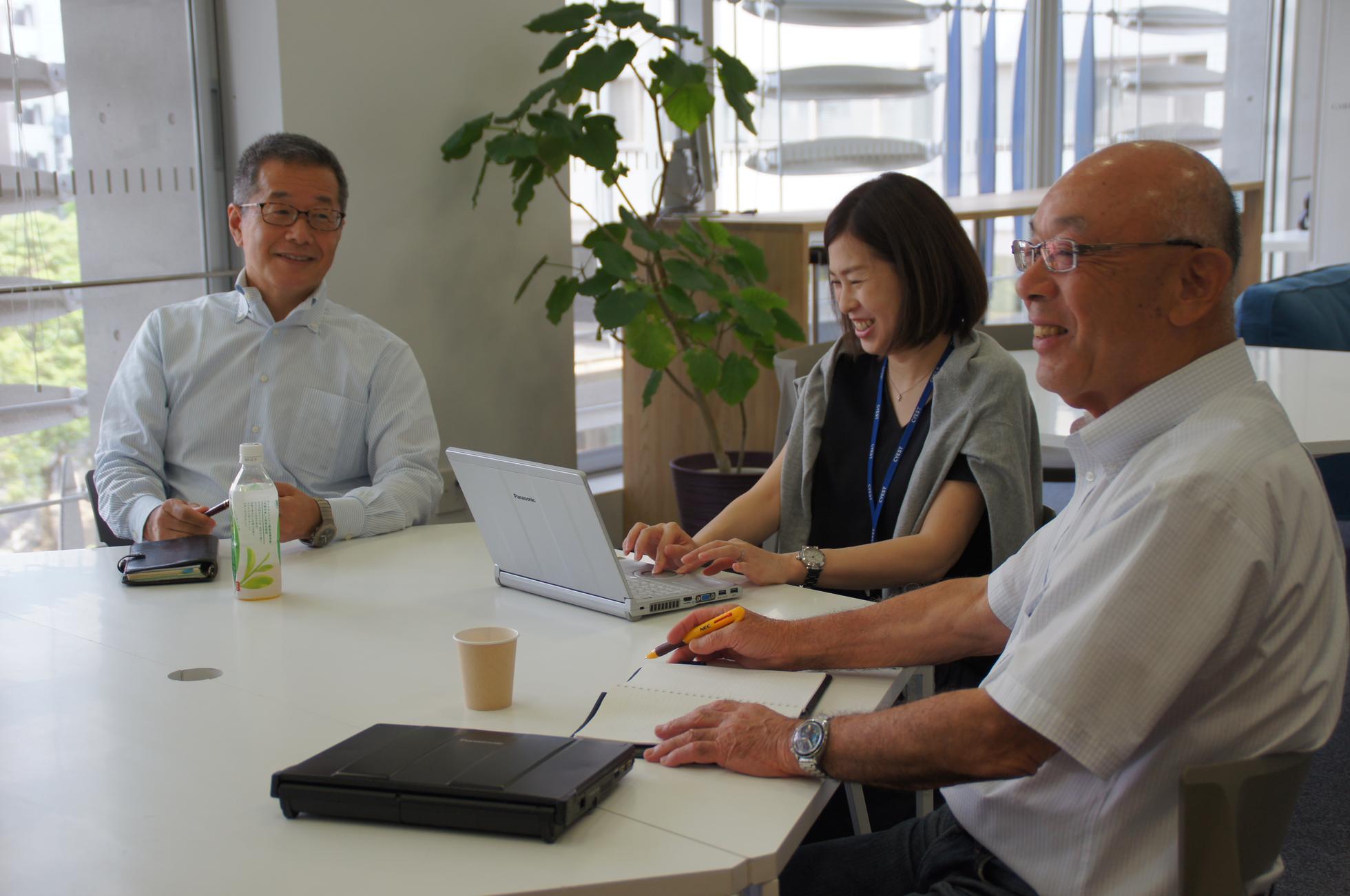 グローバル顧問の提案について打ち合わせ中な二人。オープンスペースで気軽にコミュニケーションがとれる環境です