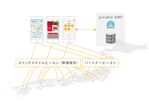 スイッチスマイルが無償で設置するビーコンと、アライアンスパートナーが設置するビーコンをネットワーク化し、 ビーコンのインフラ環境を構築。サービス提供とデータ取得の連携(横ぐし)を可能にする、管理された価値あるビーコンネットワークを形成。