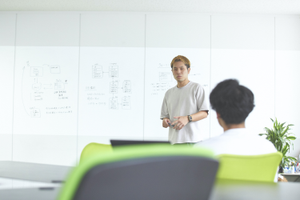 壁全面のホワイトボードでアイデアをかき出し、知恵を集めます。