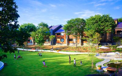 北アルプス白馬山麓、3万坪の敷地に建つ高原リゾート。客室数は全74室。