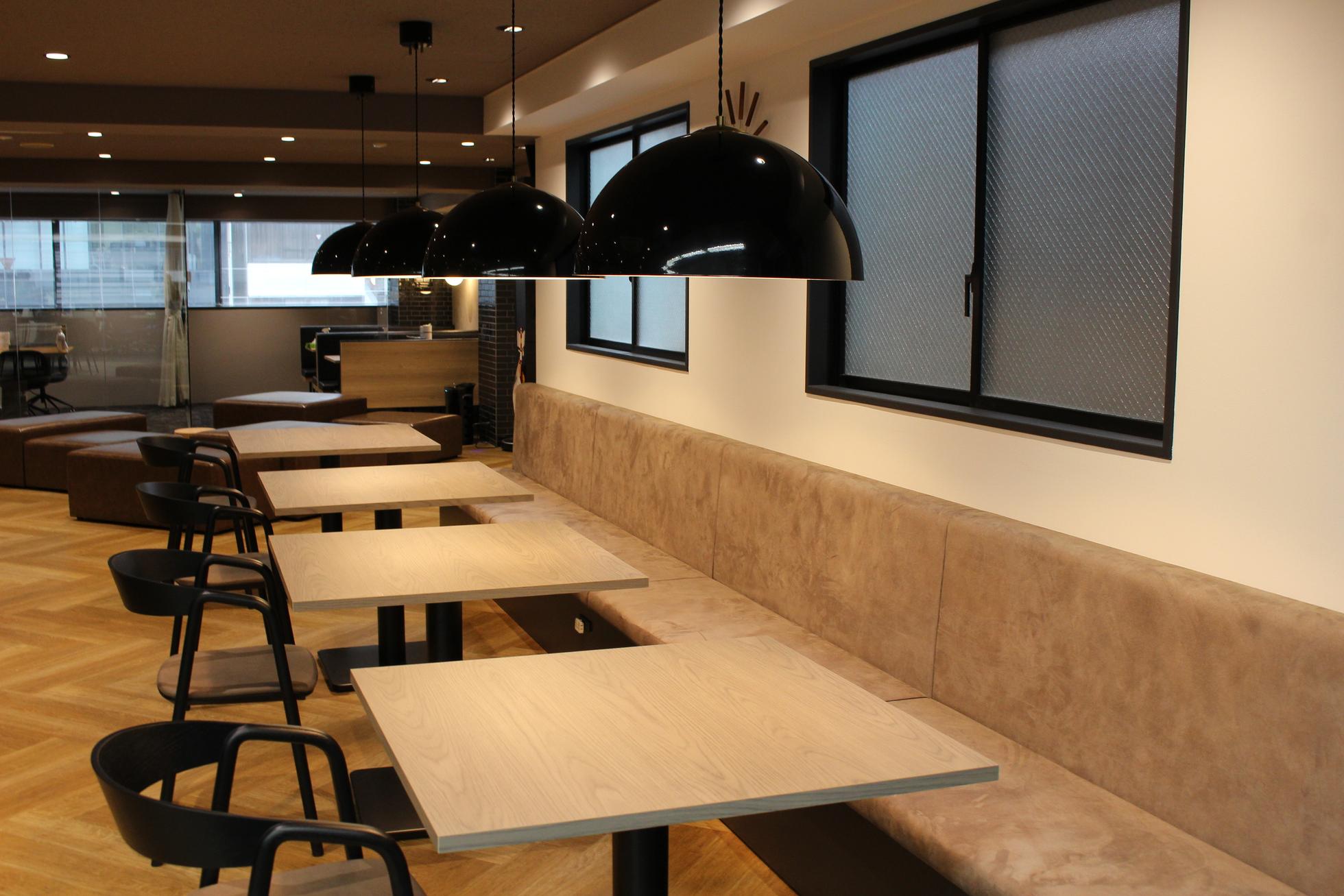 【社内の様子2】昼はカフェ。夜はBarカウンターに早変わり。コーヒーメーカーもありますので自由にコーヒーを飲んでほっと一息。夜はお酒を持ち寄って、ゆっくりと話ができるスペースです。