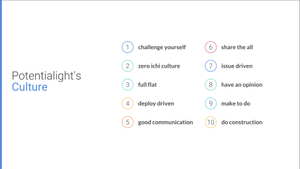 ポテンシャライトのCultureです。 当社は「Value」は理想の状態。「Culture」は今の状態として定義しています。この10つのCultureは2021年4月に全社的に共有しており、当時のメンバー全員でボトムアップ式で策定をしております。