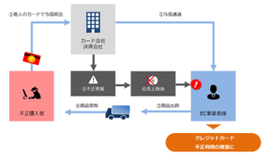 カード不正利用の流れ。こうした課題を解決するサービスを提供しています。