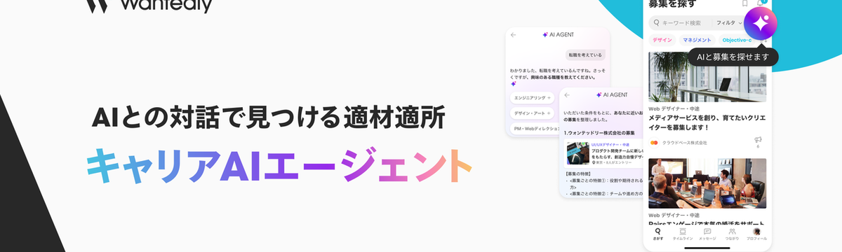 Wantedly, Inc. 4 days ago Follow Kumi Tsunoda and 8 others AIとの対話で見つける適材適所|「キャリアAIエージェント」をリリースしました この度、ビジネスSNS「Wantedly」のアプリにおいて、AIが求職者の募集探しをサポートする新機能「キャリアAIエージェント」の提供を開始します。同機能は、Wantedlyの個人ユーザー向け... Read more