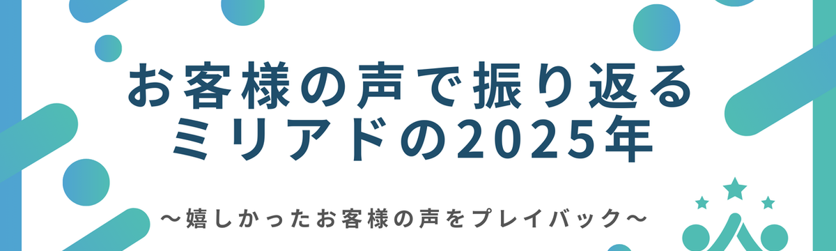 株式会社ミリアド about 7 hours ago Follow 株式会社ミリアド 人事 お客様の声で振り返るミリアドの2025年〜嬉しかったお客様の声をプレイバック〜 こんにちは!ミリアド人事です。2025年も残すところあと少し。今回は、今年1年でミリアドに届いた「嬉しかったお客様の声」を、部署ごとに振り返ってみたいと思います。Slackで共有される、お客様か... Read more