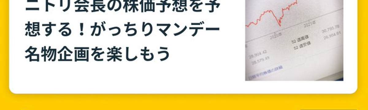 Yoshihiko Yoshida almost 4 years ago Follow ニトリ会長の株価予想を予想する!がっちりマンデー名物企画を楽しもう / おはようございます!(^_^)\ニトリ会長の株価予想を予想する!がっちりマンデー名物企画を楽しもうhttps://apple.co/3FR50jh人気の経済バラエティ番組「がっちりマンデー」... Read more