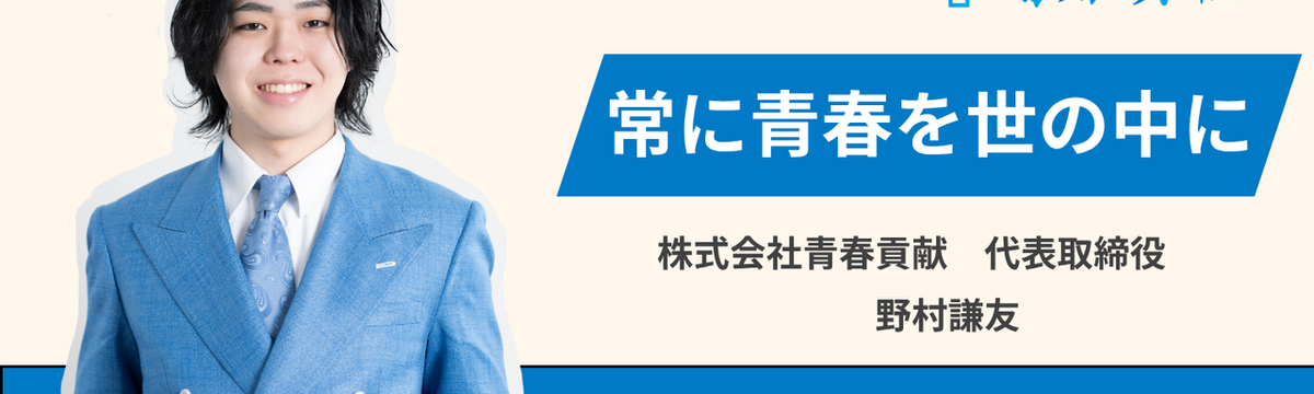 株式会社青春貢献 3 days ago Follow 高橋 颯斗 and 1 others 【社長インタビュー】常に青春を世の中に。大人になったら青春が終わるのではなく、新たに始まる世の中を目指して。 こんにちは!株式会社青春貢献の高橋です!今回は弊社代表である野村謙友さんにインタビューしてまいりました!今では会社の代表をしていますが、ご家庭での事情から大学4回生の時に営業を始め、たくさんの困... Read more