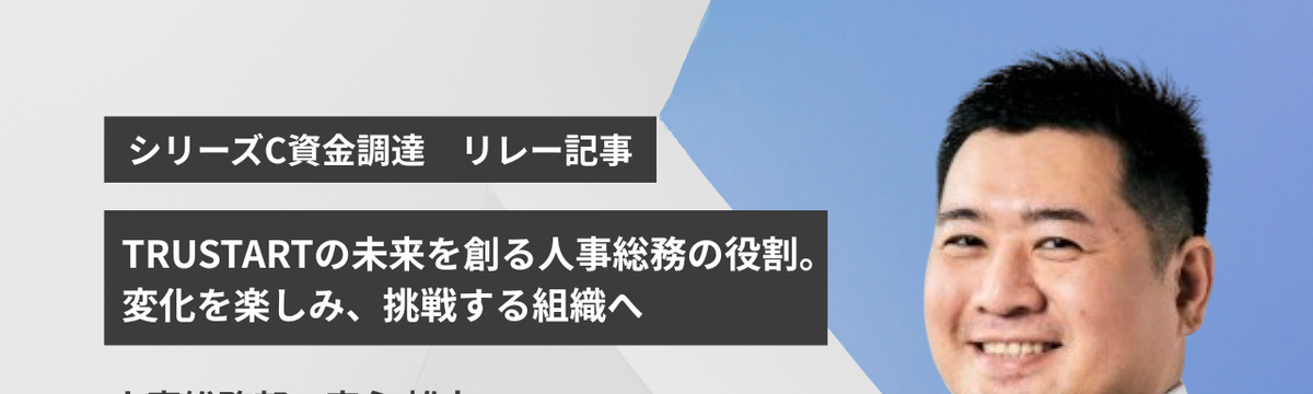 TRUSTART株式会社 about 1 month ago Follow Ryoko Shirato TRUSTARTの未来を創る人事総務の役割。変化を楽しみ、挑戦する組織へ こんにちは。TRUSTART株式会社広報担当です!先日、当社はシリーズCでの13億円の資金調達を発表しました。現在、調達を機にTRUSTARTについて広く知っていただきたく、各部署ごとにnote... Read more