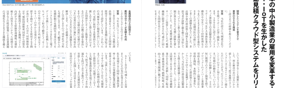 株式会社REVOX about 3 years ago Follow Miyaki Takamasa 静岡ビジネスレポートにセルボットが掲載されました! 2022年7月20日号の静岡ビジネスレポートに弊社と弊社のAI見積もりソフト「セルボット」の記事が特集で掲載されました!現在、中小製造業から日々お問い合わせが増えてきております。今後も中小製造業... Read more