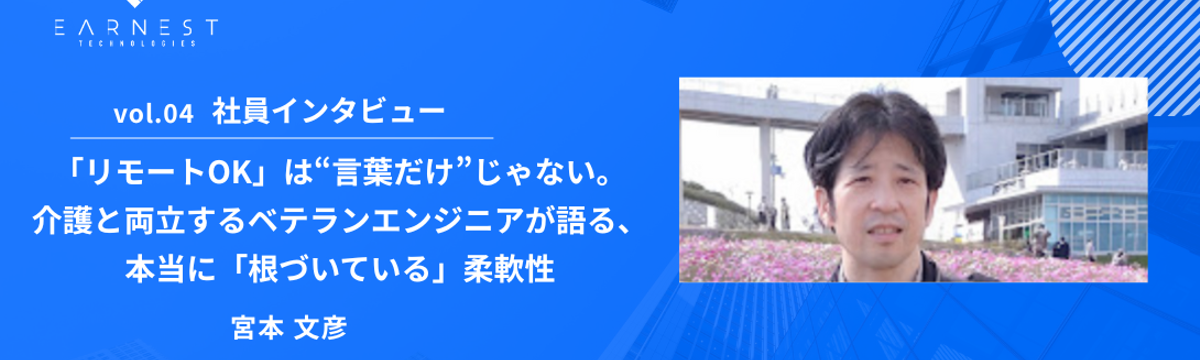 株式会社アーネストテクノロジーズ 16 days ago Follow M C vol.04 社員インタビュー / 「リモートOK」は“言葉だけ”じゃない。介護と両立するベテランエンジニアが語る... 見えない距離を信頼でつなぐ。一人ひとりに寄り添う働き方が、チームを強くするプログラマーとしてキャリアをスタートし、東京で約20年にわたりシステムエンジニアとして活躍してきた宮本さん。 2020年... Read more