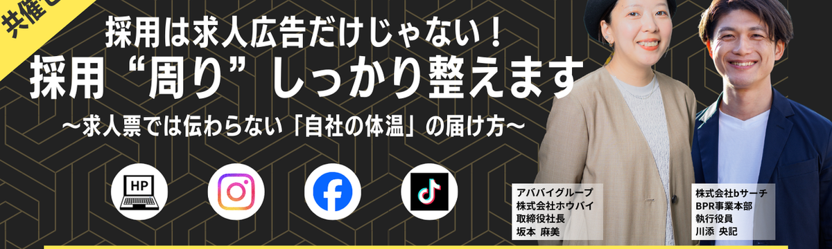 株式会社bサーチ about 1 month ago Follow ビーサーチ カブシキガイシャ 【セミナー開催】「待ち」と「攻め」の融合。dodaプラットフォームを120%使い倒すハイブリッド採用戦略セミナー 「求人広告を出しても応募が来ない」「ダイレクトリクルーティングを始めたが運用が回らない」とお悩みではありませんか?現在の採用市場において、優秀な人材を確保するためには、求職者を待つ「広告」と、自... Read more