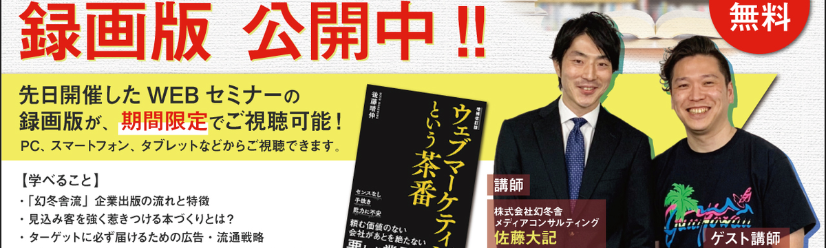 後藤ブランド株式会社 about 5 years ago Follow Mai Suda [期間限定] WEBセミナー 録画版公開中 弊社代表 後藤晴伸がゲスト登壇した、幻冬舎メディアコンサルティング様主催の、「書籍マーケティング」のWEBセミナー が、好評につき、期間限定で録画版を視聴出来るようになりました!https://... Read more