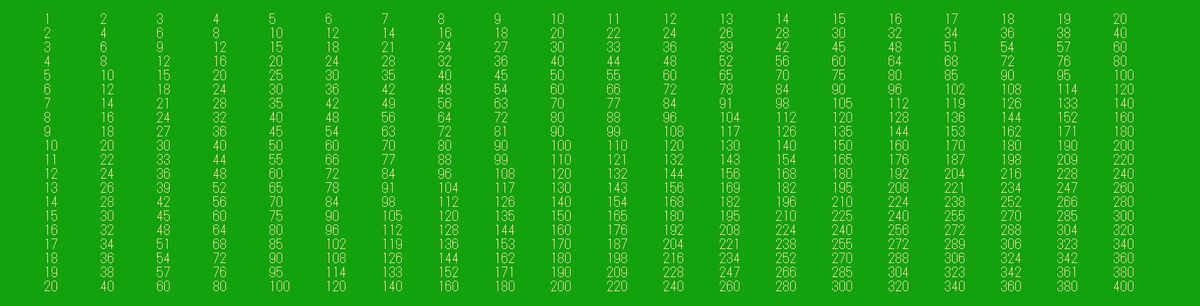 Edo Akagi over 3 years ago Follow ライフハックとしてのセルフケア javaの練習問題で一番好きなのはネストを利用した九九の一覧表を作る問題です。作るたびにうっとりしています。上の画像は、20×20の九九の一覧表です。インドではここまで暗記させるといううわさを聞... Read more