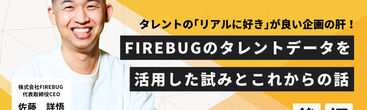株式会社FIREBUG over 1 year ago Follow Shogo Sato 「豊富なタレントデータの活用」というFIREBUGの強み〜FIREBUGの事業について(後編)〜 こんにちは。FIREBUGの佐藤です。前回のnoteでは、エンターテインメント業界に起きた「3つの変化」とFIREBUGが目指す「NEXT芸能事務所」の立ち位置について説明しました。後編では、な... Read more