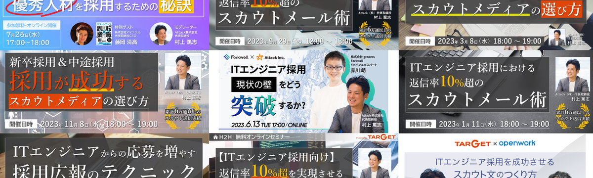 セミナーレポート almost 2 years ago Follow 黒木 さえみ and 1 others 2023年、反響の大きかったオンラインセミナー「トップ3」をご紹介します! こんにちは! Attack黒木です。Attackでは定期的に「採用」をテーマにしたセミナーを開催し、ご好評いただいています。2020年6月からは無料オンラインセミナーもスタートし、2023年も計... Read more
