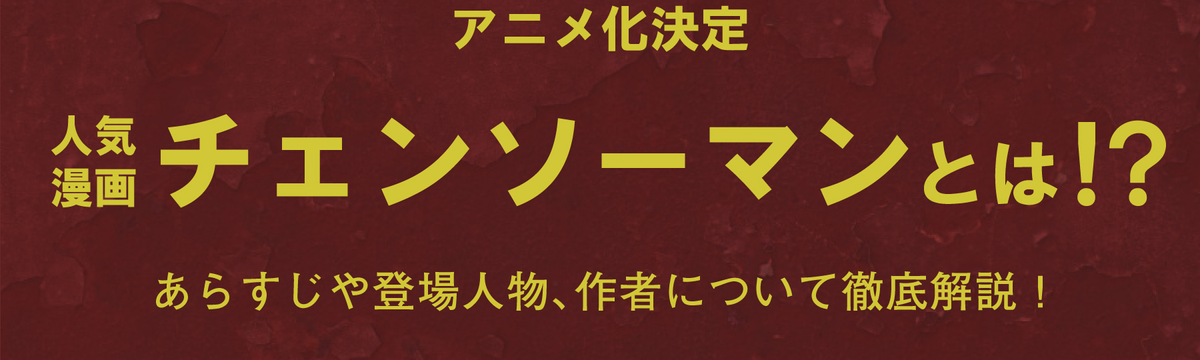 株式会社ひかりてらす over 4 years ago Follow 大河原 三紗子 【アニメ化決定】人気漫画チェンソーマンとは!?あらすじや登場人物、作者について徹底解説! 2019年に週刊少年ジャンプにて連載が掲載され、ダークファンタジーな世界観として話題作となったチェンソーマン 。作者は若手漫画家の藤本タツキ先生です。チェンソーマンは2021年1月時点での累計発... Read more