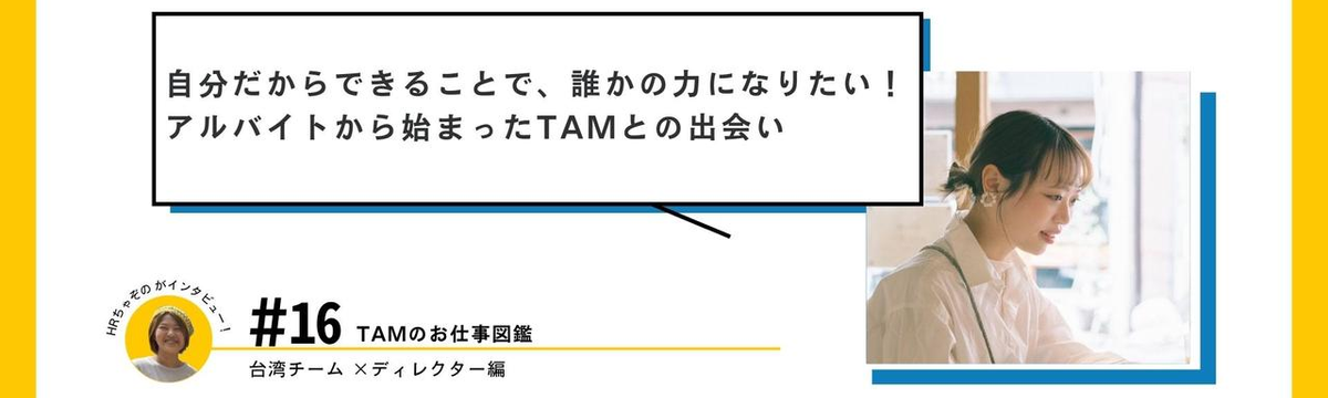 TAMのお仕事図鑑 18 days ago Follow 茶園 舞穂 「自分だからできることで、誰かの力になりたい!アルバイトから始まったTAMとの出会い」台湾チーム ディレクターりんちゃん TAMメンバーにインタビューする「TAMのお仕事図鑑」シリーズ。今回は2023年に新卒入社し、今年で3年目を迎えるディレクター周 昱齡さん(通称:りんちゃん)に話を聞きました。ーTAMに入る前は... Read more