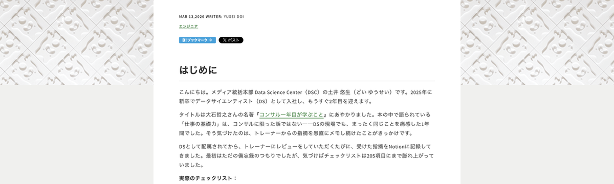 土井 悠生 18 days ago Follow データサイエンティストとして、新卒一年目で学んだことをブログにまとめました データサイエンティスト(DS)として、新卒一年目で学んだことをブログにまとめました。学びの多い一年を振り返り、DSとして、そして社会人として働く上で重要なことを書いています。以下が記事のリンクに... Read more